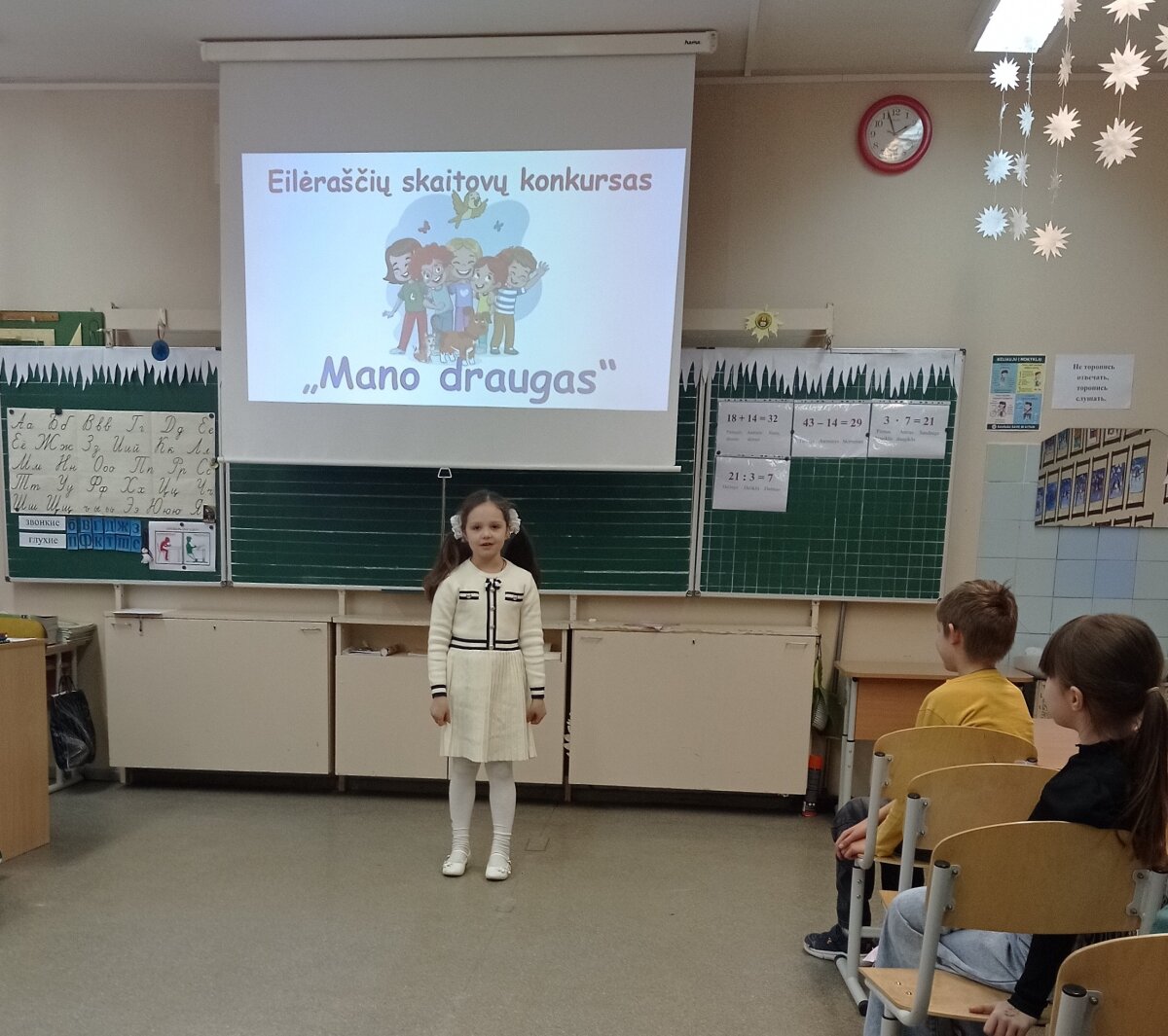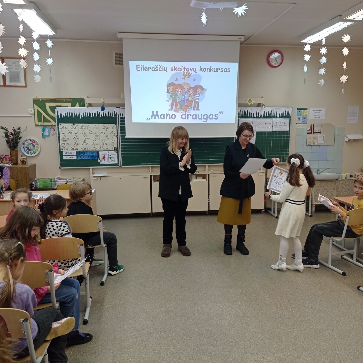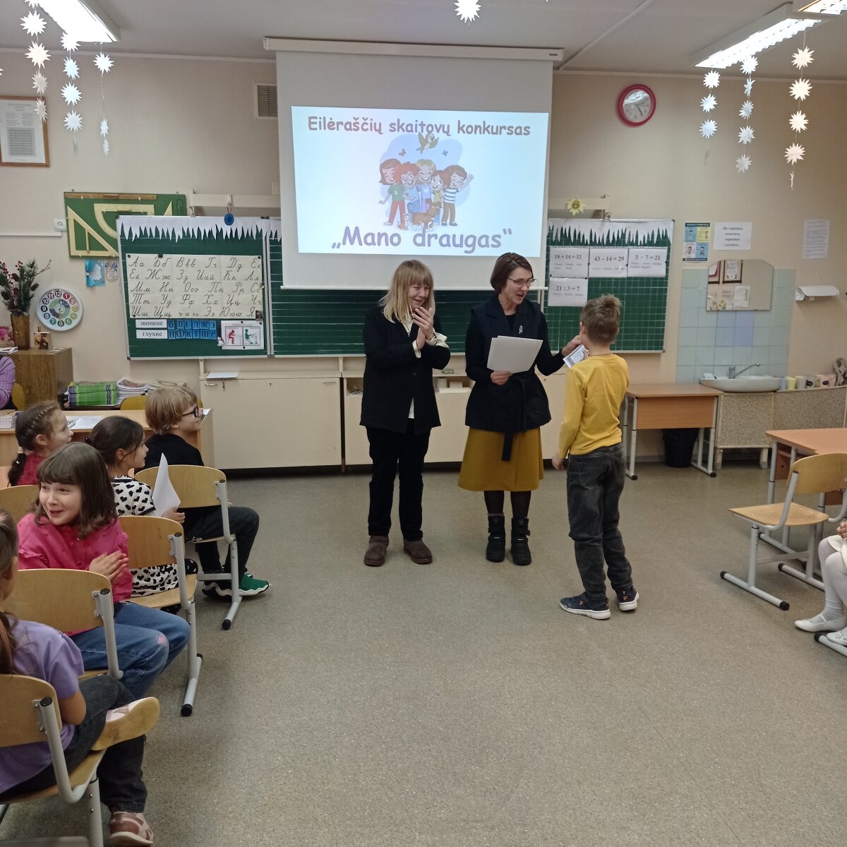 Nugalėtojai buvo apdovanoti diplomais, visi dalyviai gavo padėkos raštus. Konkursas vaikams suteikė bendravimo džiaugsmo ir pasitikėjimo savo jėgomis. 2 klasių mokytojos Regina Trukan ir Tatjana Orechova dėkoja žiuri nariams Marinai Lukšis, Larai Chrechkovai ir Natalijai Frolovai, taip pat tėvams už pagalbą rengiantis konkursui.